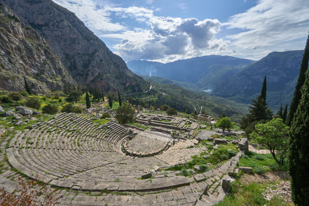 Der Sage nach entsandte der Götterkönig Zeus aus verschiedenen Richtungen Adler, um den Mittelpunkt der Erde zu finden. Die Adler trafen sich in Delphi und diesen Punkt nannte Zeus „Nabel der Welt“. Der Gott Apollo errichtete hier sein Heiligtum, als er den Drachen Phython bezwang. In Delphi lag auch das berühmte Orakel.