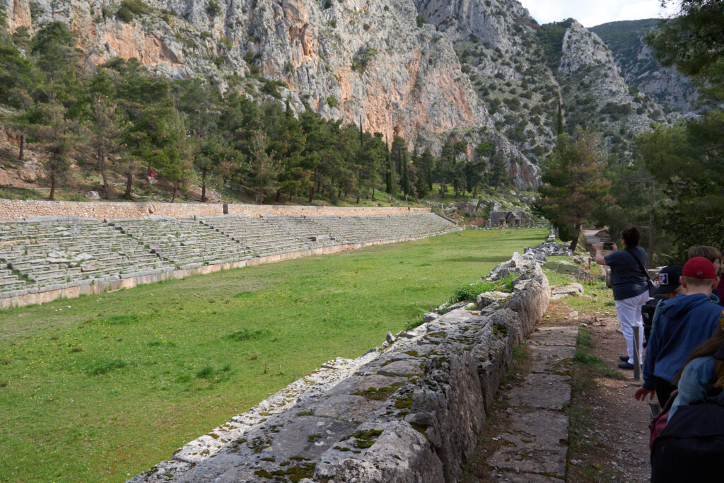 Wenigstens am Morgen ist uns der Wettergott gnädig und wir haben ein paar sonnige, regenfreie Stunden für die Besichtigung des weitläufigen Ausgrabungsgeländes. Die Anlage liegt phantastisch eingebettet in die Landschaft am Fuß des Parnass Gebirges. Man überlickt von hier in 850 m Höhe ein Gebiet mit tausenden von Olivenbäumen, das sich bis zum Meer erstreckt.