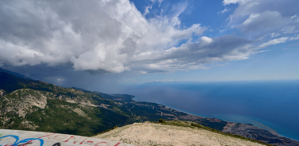 Von dort aus geht es über den spektakulären Llogara-Pass auf über 1.000 m Höhe über viele enge Serpentinenabschnitte. Man hat tolle Aussichten, auch wenn das Wetter nun gar nicht mehr gut ist. Leider sieht man auch von oben die gigantischen Bauabschnitte unten am Meer. Da unten werden offensichtlich ganze Touristenstädte aus dem Boden gestampft. Oben auf der Spitze des Passes geht ein sehr rauer Wind. Manfred möchte schnell bei einem Imker Honig kaufen. Der alte Mann mit seinem Neffen preisen auch noch ihre Nüsse und Beeren an. Im Nachhinein stellen wir fest, dass wir die gekaufen Honiggläser auf der Mauer dort stehen gelassen haben.