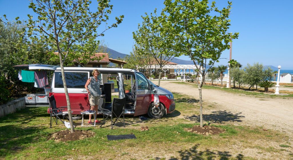 Auf dem Weg nach Albanien legen wir noch einen Stopp in Parga ein, ein schönes Städtchen am Meer. Allerdings wurden alle Straßen der Gemeinde aufgerissen und die Stadt ist eine Baustelle. Wir parken unseren Bulli etwas außerhalb, trinken in einem sehr überteuerten Café / Green Backery eine Kaffee und machen und auf zu unserem Campingplatz Valtos, der heute erst eröffnet wurde. Wir stehen mit noch 2 Campern sehr schön unter Olivenbäumen. Die Regenpausen nutzen wir, um ein wenig am Strand zu laufen. Am frühen Abend gehen wir nochmal nach Parga über den Strand und dann steigen wir über die Treppen und Wege steil hinauf in die Stadt. Wir essen recht nett im einzigen geöffneten Restaurant. Beim Rückweg rutsche ich auf dem steilen Abstieg aus (die neuen Wanderschuhe haben leider eine sehr rutschige Sohle) und schlage mir das Knie auf. Alles noch dran, aber der Schreck war groß.
