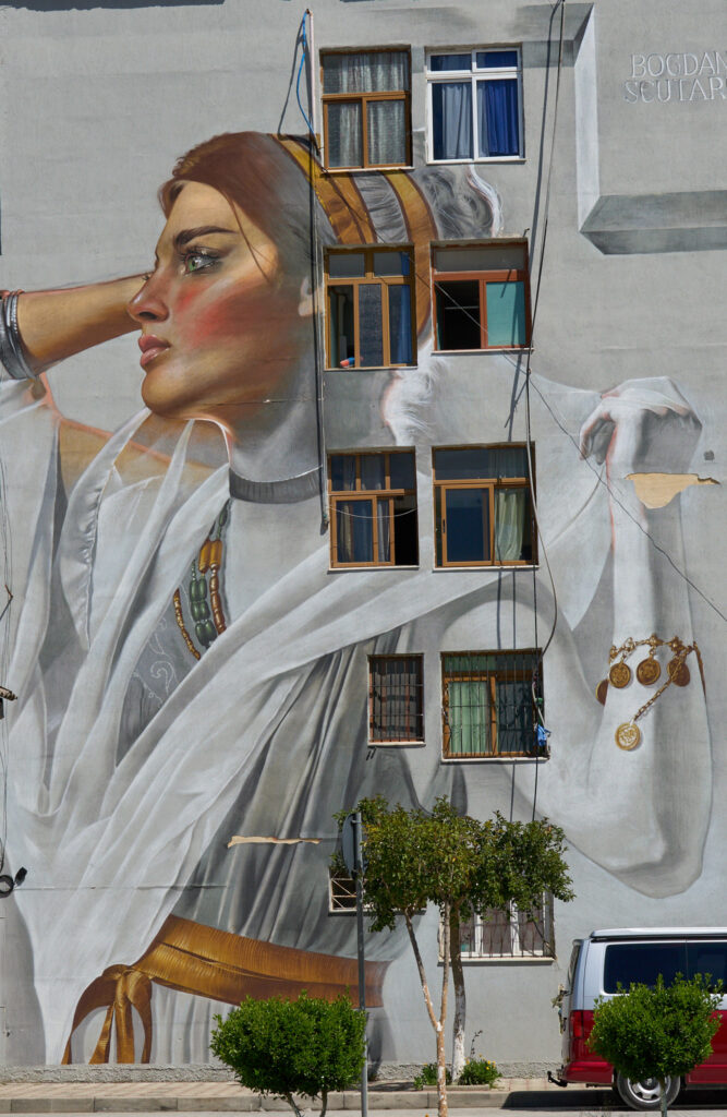 Bei der Ausfahrt aus dem Ort entdecken wir noch ein schönes Mural mit guter Parkmöglichkeit, das Manfred auch sofort photografisch in Szene setzt. Elisabeth nutzt die Zeit, um frisches Obst und Nüsse einzukaufen.