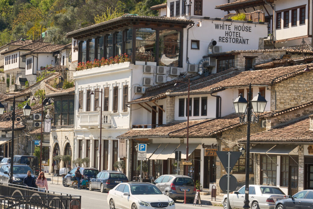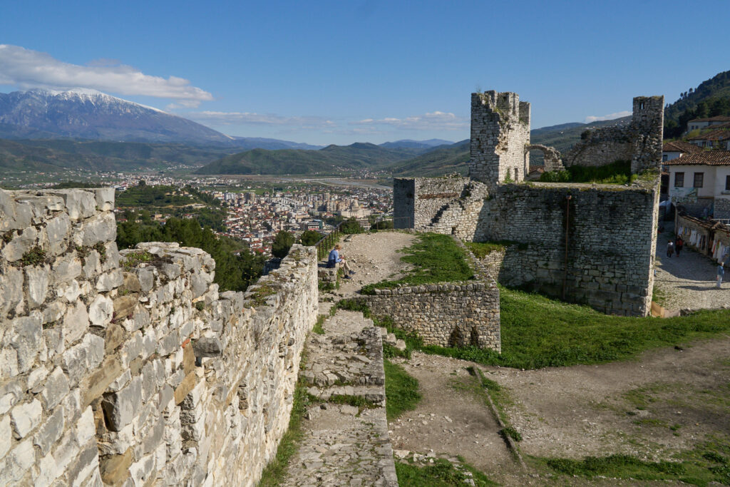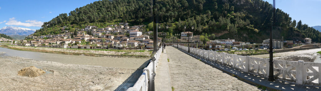 Zu Fuß sind es ca. 30 Min in die Stadt, immer am Ossum Fluß entlang mit Blick auf die schneebedeckten Berge. Berat liegt in der Nähe des Tomorr Nationalparks mit Bergen über 2.400 m, die sich noch schneebedeckt zeigen. Die Luft ist wunderbar klar und kalt. Es ist trocken und man hat eine gigantische Fernsicht. Berat besteht aus verschiedenen Stadtteilen, die Neustadt und Kalaja, die Altstadt auf dem Berg sowie Mangalem, die türkische Viertel und Gorica, der christliche Teil an der anderen Seite des Ossum Flusses.