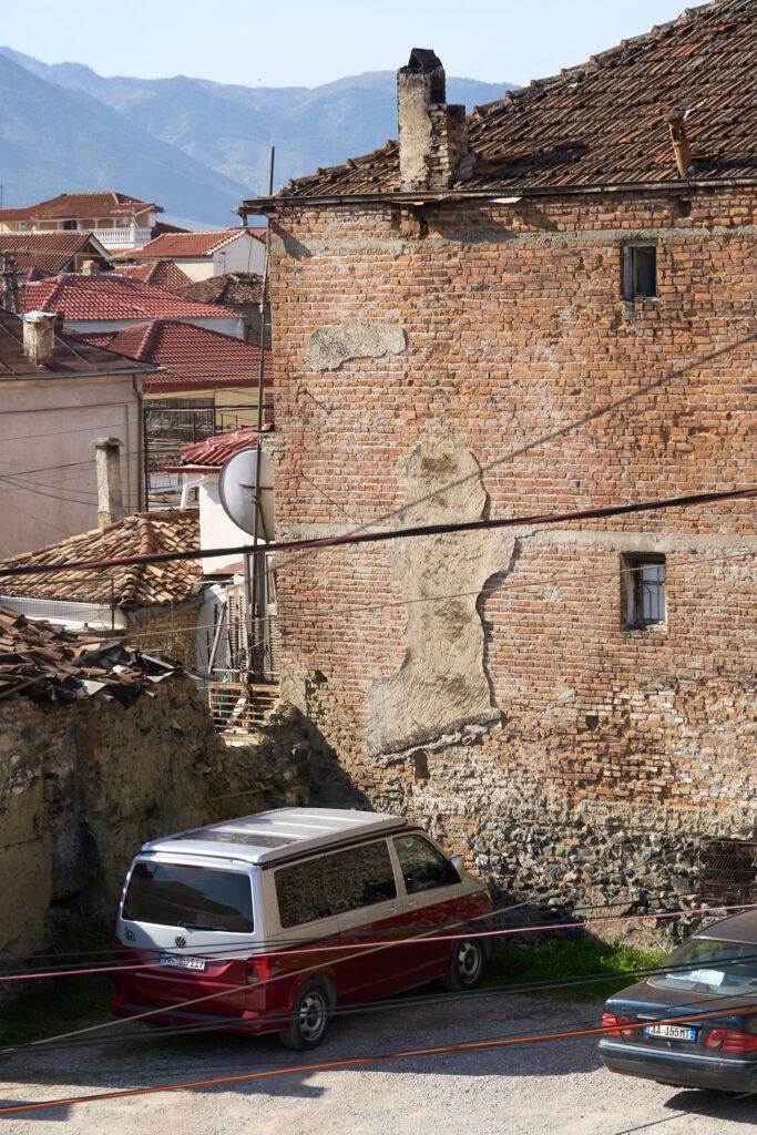 Wir erreichen Korce gegen Abend und übernachten in einem sehr schönen stylischen Hotel in einer Nebenstrasse dirket am alten Basar. Das Tree Hotel hat nur 8 Zimmer, die alle wunderbar saniert wurden und ist mit 4 Sternen ausgezeichnet. Unser Bulli steht auf einem bewachten Parkplatz im Innenhof gegenüber umringt von sehr baufälligen Gebäuden. Von unserem Hotelzimmer können wir auf den bewachten Parkplatz blicken. Es ist mal wieder sehr kalt und wir machen uns auf in ein Restaurant am alten Bazar.