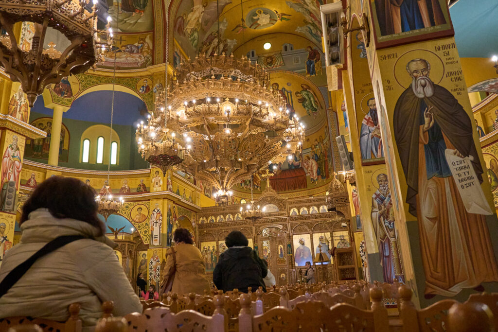 Die Kirche ist komplett erhalten und weist noch einen schön verzierten Säulengang auf, wo man Kerzen opfern kann. Im Inneren befinden sich wertvolle, geschnitze Ikonenstase. Auf dem Rückweg finden wir ein nettes Gartenlokal und essen zu Abend.