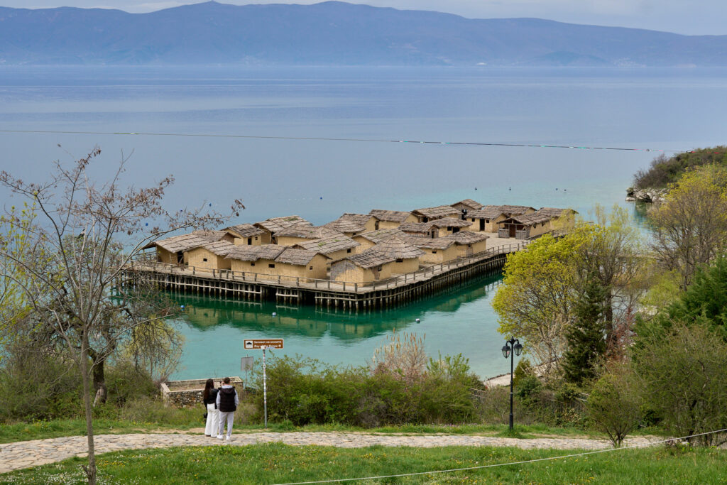 Wir müssen uns von unserem sehr komfortablen Hotelchen verabschieden und starten Richtung Orchidsee/Orchid Nordmazedonien. Auf der Fahrt dahin werden wir durch eine ziemlich lange Baustelle am Seeufer geführt, die dann jedoch an einer Sackgasse endet. Also alles wieder zurück. Auf unserem Weg nach Orchid liegt das Museum „Bay of the Bones“ eine authentische Teilrekonstruktion von 24 Hütten mit Innenausstattung einer prähistorischen Pfahlsiedlung aus den Jahren 1200 – 700 v. Chr. Leider ist heute Montag und das Musum ist geschlossen.