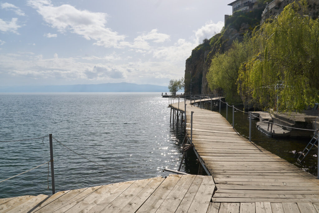 Es gibt einen schönen Holzsteeg entlang am Meer, der nach Kaneo führt, das einstige Fischerdörflein der Stadt. Wir durchqueren die Altstadt mit den weit in die Gassen hineingreichenden Erkern. Oberhalb der Altstadt thront auf einem Felsvorsprung das wohl berühmteste Fotomotiv Ohrids, die Kirche des Heiligen Apostels Johannes von Kaneo aus dem 14. Jhd. Wir besuchen die Kirche, machen Fotos und umranden den Berg auf einem ausgewiesenen Spazierweg.