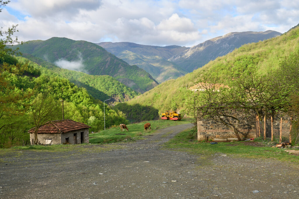 Blick von Paulines und Volodomirs Haus ins Tal. Die beiden Kühe gehören ihnen auch.