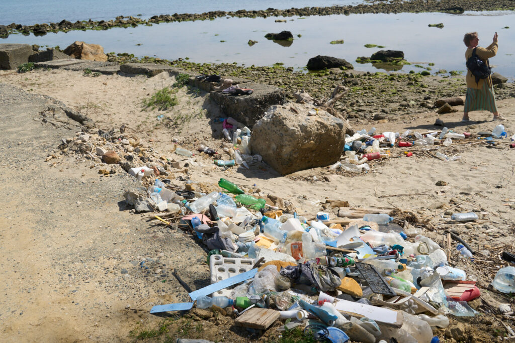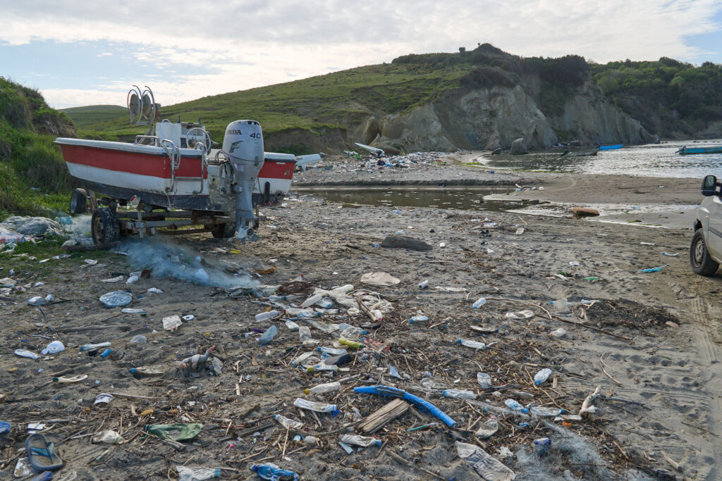 Vermüllter Strand in der Nähe unseres Stellplatzes. Aufräumen: ein aussichtsloses Unterfangen.