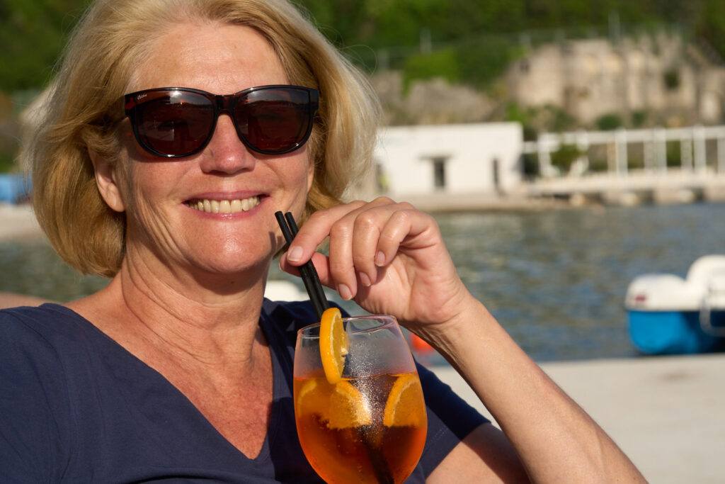 Elisabeth geniesst einen Aperol Spritz in dem Restaurant am Hafen.