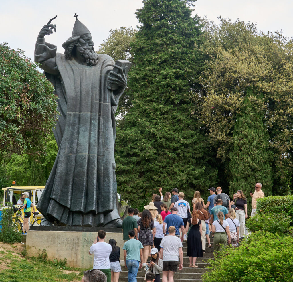 Am nächsten Tag fahren wir mit dem Bus nach Split, deren Glanz von dem römischen Kaiser Diokletian begründet wurde. Der Imperator liess sich vor Ort einen pompösen Palast als Altersruhesitz erbauen. Die Stadt hat wirklich viel zu bieten. Der Diokletianpalast ist in bestem Zustand und mitten in der Innenstadt zu finden. Split hat insgesamt vier Tore, die sich über die Stadt verteilen. Außerdem besichtigen wir die riesige 10 m hohe Statue von Gregor von Nin. Sein Zeh ist ganz blank geputzt, ihn zu berühren soll Glück bringen.